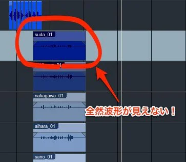 S1の開発元はPresonus。ハードウェアからウェブサイトまでイメージカラーは青ですよね。そのこだわりがS1にもしっかりと反映されているのですが、問題はクリップカラーに対して波形の表示が見にくい事です。