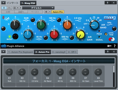 意外と見過ごされがちですが、Midiコントローラーとの連携が非常に便利です。プラグイン毎にどのノブがどのパラメーターかを「プロジェクト単位でなくS1全体で記憶してくれる」のが大きな特徴です。上記のスクリーンショットにもある通りMaag EQ4のパラメーターとAxiom Proのノブがそれぞれ割り振られていて、一度記憶させるとプロジェクトを超えてコントロール出来るようになるので、普段使うEQのパラメーターとコントロールサーフェースを紐付けておけば、アナログミキサーを扱う感覚で直感的に操作できます。同じような事は他のDAWでも出来ますが、毎回アサインしなおしたり非常に面倒で、アサインする作業の時間の方が音を作る作業より長くなることもあるのでは?