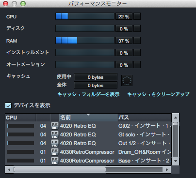 多かれ少なかれ、DAWのソングファイル(Protoolsだとセッションファイル)というのは、どんどん容量がかさんで重くなるのは仕方がないというのはわかっているのですが、それにしても重いです。作曲するだけならばそれほど気にならないのですが、作業が進み、全トラックをオーディオ化して、ミックス作業のためにエフェクトプラグインをどんどん使っていくと、保存の度に数十秒〜1分近く取られる事があります。同じような作業をProtoolsでもしてきたのですが、こんなに保存に時間がかかるというのは経験したことがありませんでした。ひとつ断っておくと、S1自体の動作自体は非常に軽快で、作業がサクサクすすんでいるのに、自動保存の度に操作不能になり、再生は進み続けるというのが問題で、2分程度の曲だと、曲の途中で保存が始まると曲の最後まで行くまで何も出来ないというちょっとヒヤヒヤする感じを毎回体験する事になってしまいます。まだ保存のせいで強制終了をしたことはありませんが、今後の改善に期待したいところです。